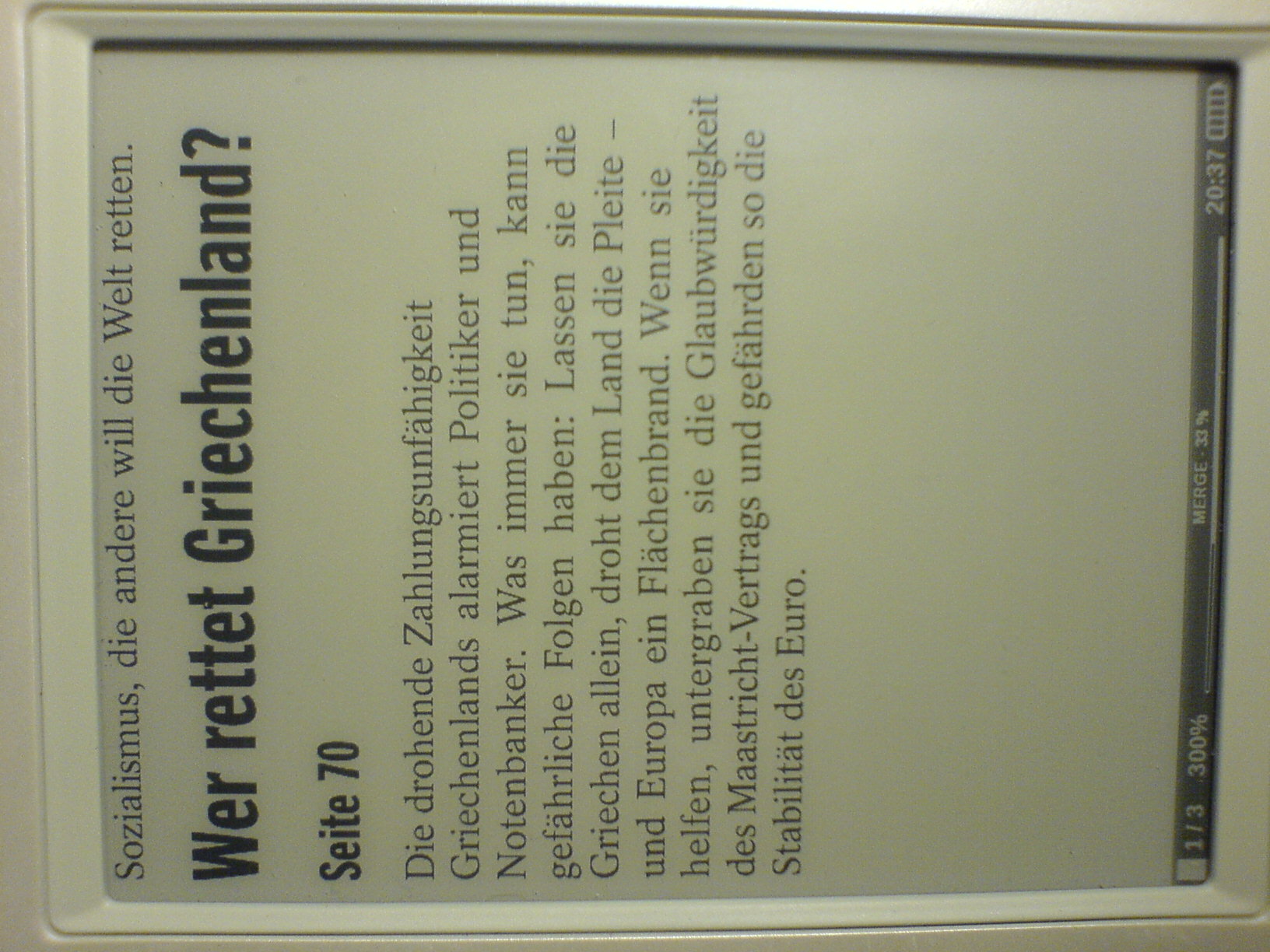 Wenn man beim Spiegel ein Abo hat bekommt man ja Sonntag abends schon die Ausgabe als pdf, wie diese Datei dann auf dem Reader aussieht würde mich interessieren. Da meine Eltern den Spiegel haben, ich aber etwas weiter weg studiere, könnte ich so diese pdf's nutzen. Am Rechner lesen macht nämlich keinen Spass.