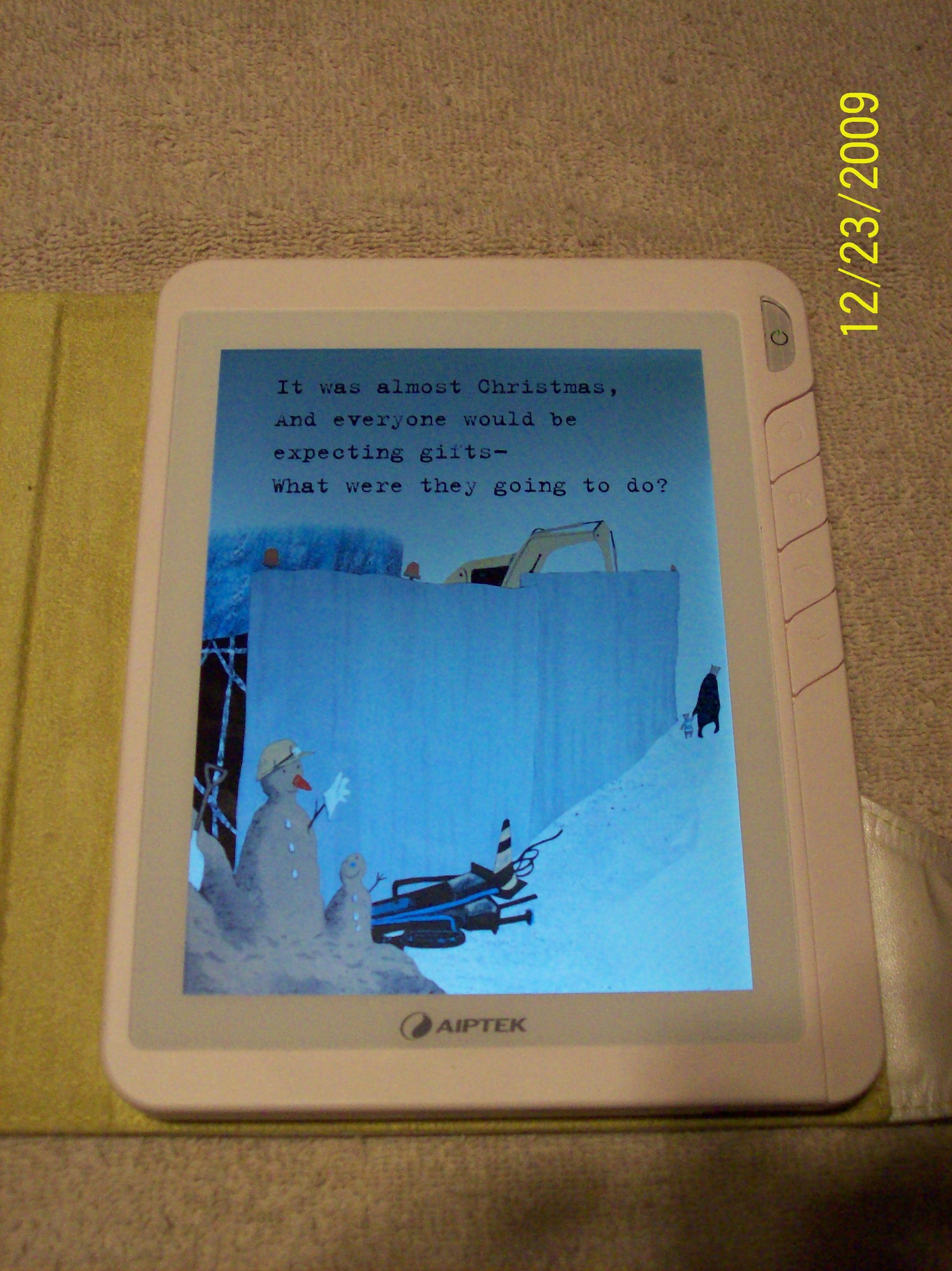 The Story Book in Color has an 8" LCD screen, and the dimensions are about an inch taller and wider than the original Kindle. It doesn't have a touch screen, but it does have speakers, USB Host, and a SD/MMC/MSPro card slot. It has a white book like case that is covered with speckles of color. The inner lining of the case is soft green faux leather with 3 slots stitched in the opposite face for spare SD cards. It can play MP3s and show jpeg images, but the only ebook format that it supports is proprietary to Aiptek. I've already asked for a copy of the software needed to make the ebooks; they said no. It came with 20 ebooks, and they all have a target audience in the 4 to 8 year old age group. All the ebooks have color page images, and all are narrated. Eric Carle's works are a good example of the type of book that would fit the design intent of this device. Now let's consider what's wrong with the Story Book in Color. It's obvious that the target audience is small children. I do not understand why Aiptek would expect that the average 6 year old could be trusted with a $200 piece of electronics. Nothing against children here; it's just that they're destructive little buggers. Think about this device's abilities. It shows images and plays words. Why would someone buy this when they already have a television that does the same thing? Literally the same thing. Consider the locked in format. One must buy all ebooks from Aiptek. Why would you do that when anyone who had kids probably already has a collection of kid's movies? Lastly, why did they add those slots for spare SD cards? Don't they realize that some kid would take the card out of the slot and try to swallow it? I figured that out right away, and I don't even _have_ kids. Frankly, I do not see why anyone would buy this. Last edited by Nate the great; 12-24-2009 at 09:54 PM. |