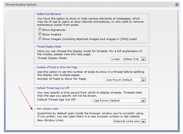 In your User Control Panel go to Edit Options. There, under "Thread Display Options", you find "New Window Links" which allows you to choose whether hyperlinks should remain in your current browser window or open in a new window / tab. Screenshot attached. |
