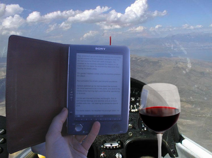 What is more relaxing than flying your jet in a nearly blue sky with a good book to enjoy it. The only thing missing here is the wine. Et voilà... |