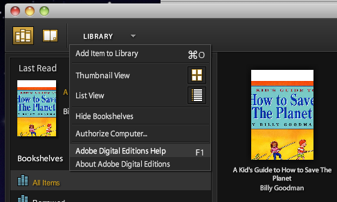 I've looked through the list of forums and I can't see one that would answer my next question, another, I'm sure daft question, so apologies because no doubt I'm posting this in the wrong place but.... Since last logging on here I have down loaded Adobe digital editions, I registered the lap top and installed the software and then tried to down load a book from their library. Clicked several times on 'download and read' and nothing at all happened. I have no idea why. So then I went to Manybooks and downloaded a book. all well and good, up it pops and I dropped it onto my desk top, but I can't see how I can get it into the Adobe library programme. I can see I need to select 'Add item to library', and i can see my desk top, but the book file is greyed out and I can't select it. Looking into Finder I see that all files are greyed out. Hmmmmmm. And there seems to be no help option in the programmes' toolbar. Any ideas? Sorry to take up your time, thanks for patience. My needs are simple so I'll be out of your hair soon : ) Again, thanks |
