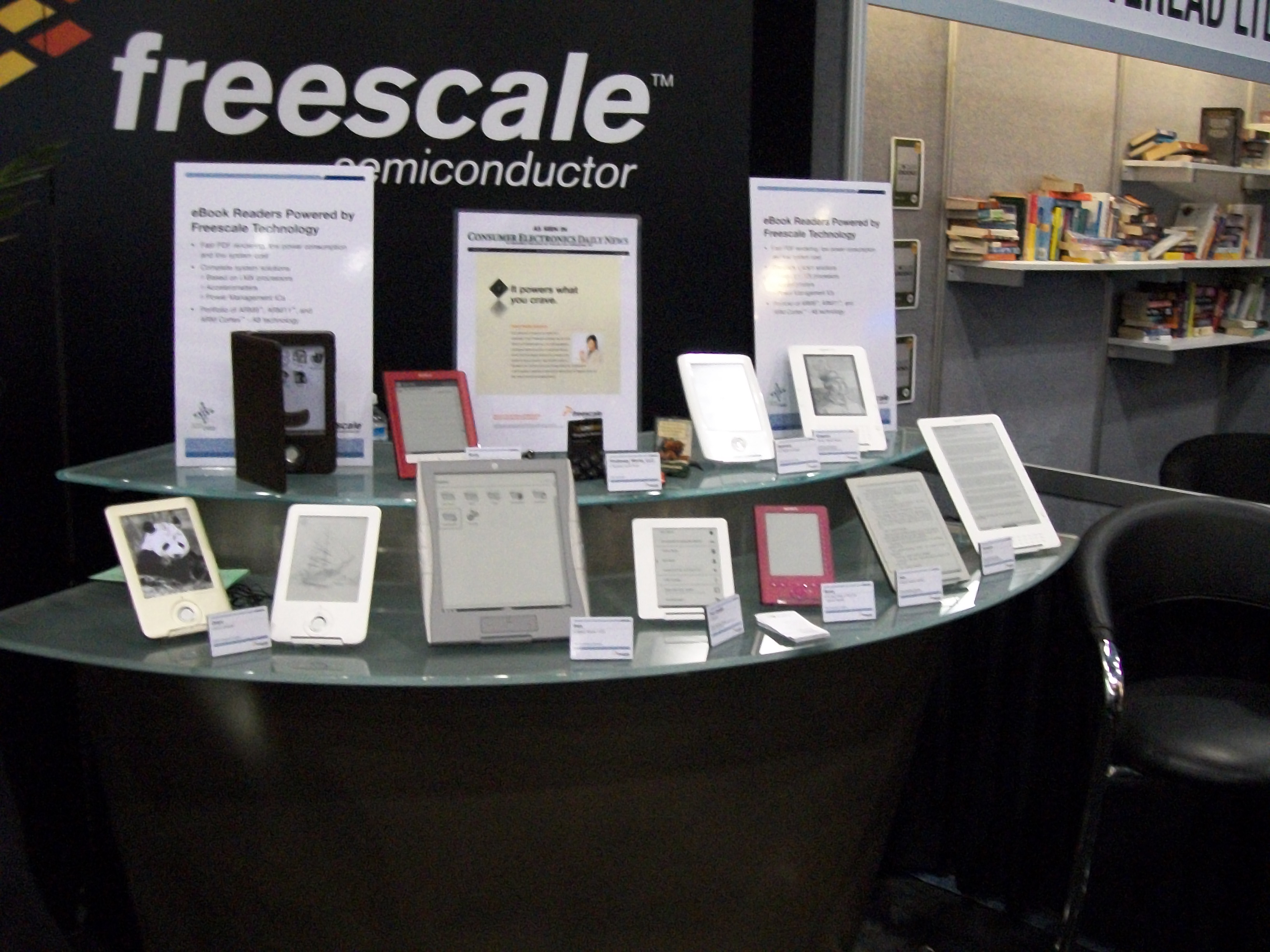Freescale is a CPU manufacturer. Their chips are in a lot of devices including ebook readers. They had in their booth one of each of the major ebook readers that use a Freescale processor. I'd like to thank whoever thought up that idea; it was fun to see all those devices in one place.