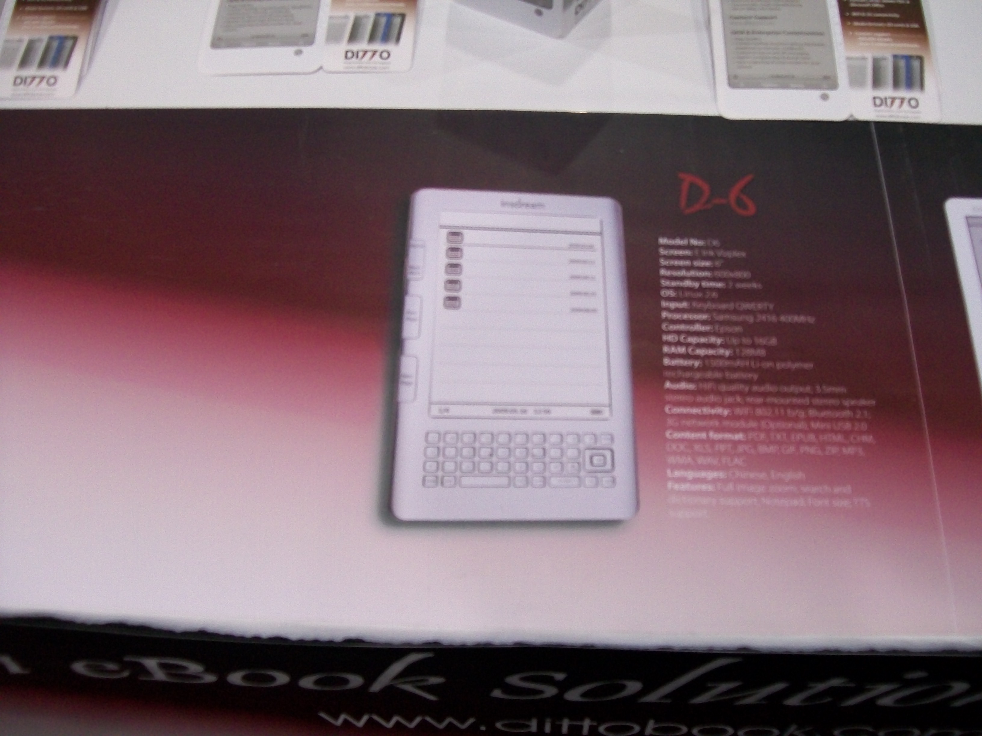 When I stopped by their booth today, I learned that Ditto Book now offer both the D-6, a 6" ereader with keyboard, and the D-9, a 9.7" with touchscreen. The larger one was not on hand, but they did have the D-6. They actually have 3 devices to offer under this model name. All have keyboards, and they all come with FBReader. I identified at least one of the 6" units as being made by Insdream. You may recall I mentioned a e-reader with an unusual LCD screen a while back. That was it. The screen was a little odd, but it was usable. Ditto Book will soon be selling the D-6 and D-9 retail at www.dittobook.com. The expected retail is $249 and $429 (they were less than certain on the price of the D-9, so it could be wrong). P.S. In the pictures below, the gray ereader is the one with the LCD screen. Last edited by Nate the great; 05-16-2010 at 10:20 AM. |