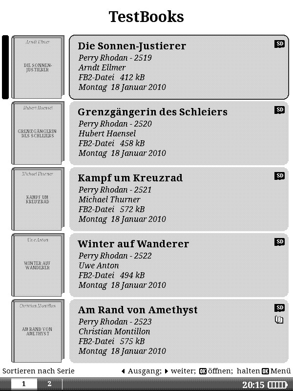 Ich vermute das zum Auslesen dieser Informationen auch in der Buch-Auswahl FBReader verwendet wird, da die selben Infos im FBReader unter 'Über das Buch" angezeigt werden. Leider unterstützt ePub offiziell keine Serien-Infos. Calibre speichert allerdings in der Datei 'content.opf' im ePub die Tags '<meta name="calibre:series" content="Perry Rhodan"/>' und '<meta name="calibre:series_index" content="2526"/>'.
