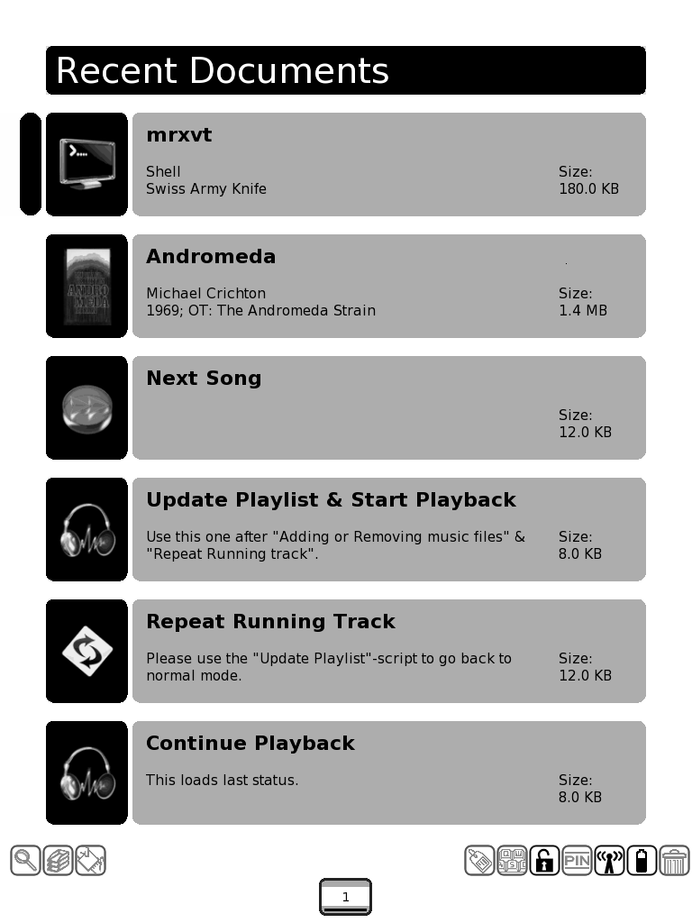 The best way to use mpd is usage of "recent documents". When you use the "status message", & "next song" buttons once after starting mpd, they are all together in the list with the document which you read. Then it is easier to switch back & forth between music box controls & document. I attached "link_buttons_to_Recent_Documents.zip" [which is a visually modded older script]. We should find a way to sort the Conentlister Playlist by album [creating a subfolder for each one], navigaton though the list with 44 song is ok, but when my CF 16 GB comes at home, I want to have more albums on card.[EDIT]: scripts are not compatible with os 2.10. Last edited by yokos; 06-14-2007 at 10:08 AM. Reason: 16 GB card |
