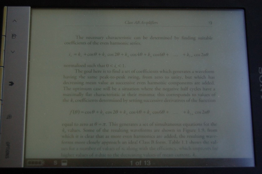 I have loaded both pdfs on the reader. No problem. I also tried to convert to ePub but unfortunately don't know enough about it so it came out looking weird - someone with more knowhow might be more suited to do that. The refreshing rate when turning the pages was instant so I would put that at 1 second (if the text size is set at small which seems the preset for the document). I opened each document and photographed it in portrait, landscape (both in size small) and once each in size medium. Increasing the size doesn't do the document any favours as it appears as if the graphs and tables disintegrate. However, zooming into the document to have a close look at the graphs is possible (sorry I didn't take a picture but can if you want to see it.) Sample C can be increased in size but it then looses it's page layout. I found the text in both samples hard to read on small size. But then again I am wearing reading glasses which might need upgrading. |