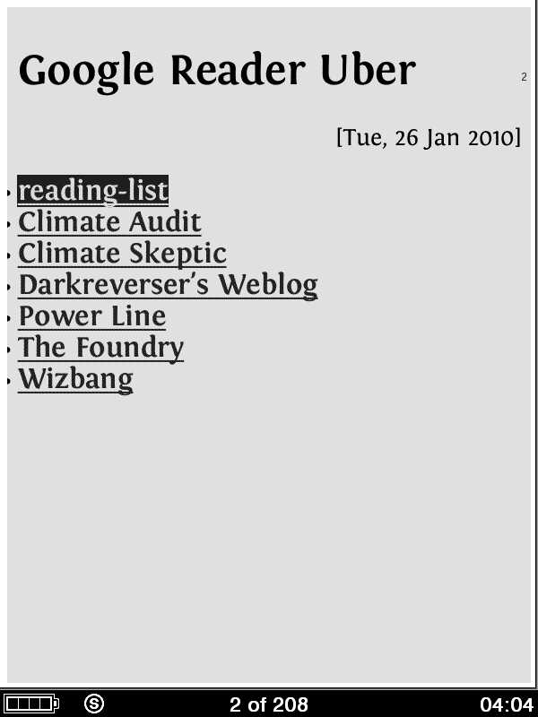 What does tagged mean in Google Reader? Tagging means that you have added your feed to a folder under the manage subscriptions link. Every subscribed feed starts out not in a folder. Adding the subscription to a folder tags the feed with the folder name. You can add all your subscriptions into one folder called "news" or be more creative. I just placed each subscription in a folder the same name as the subscription. Of course you don't have to place any subscriptions into folders if you prefer. I placed my subscriptions in folders because I was using Google Reader Uber which creates a single reading-list. I thought that placing them in folders might make my output look prettier and be more manageable. Well it did pretty it up. Now instead of just the reading-list my feeds were also in sections. Once I managed all of my subscriptions in Google reader it dawned on me that I was tagging my feeds by placing them in folders (sometime I am a little slow). I went back to try the recipe Google Reader and it looked the same except there was no reading-list section. The kicker! It turns out that once I placed all my subscriptions in folders I was downloading everything twice using the recipe Google Reader Uber. Once for the big all encompassing Reading List then again as it skillfully grabbed the items in the folders. To clarify what I'm saying I have attached two screen shots. I used the Google Reader recipe for one and then the Google Reader Uber recipe for the other. The same exact articles were grabbed by both. You can see that the book created by Google Reader recipe is only 111 pages where the book created by the Google Reader Uber recipe is 208 pages. The Uber book is larger due to the fact that I placed everything in folders. Because my subscriptions are in folders the Uber recipe actually went out and grabbed the articles twice. Bottom line: