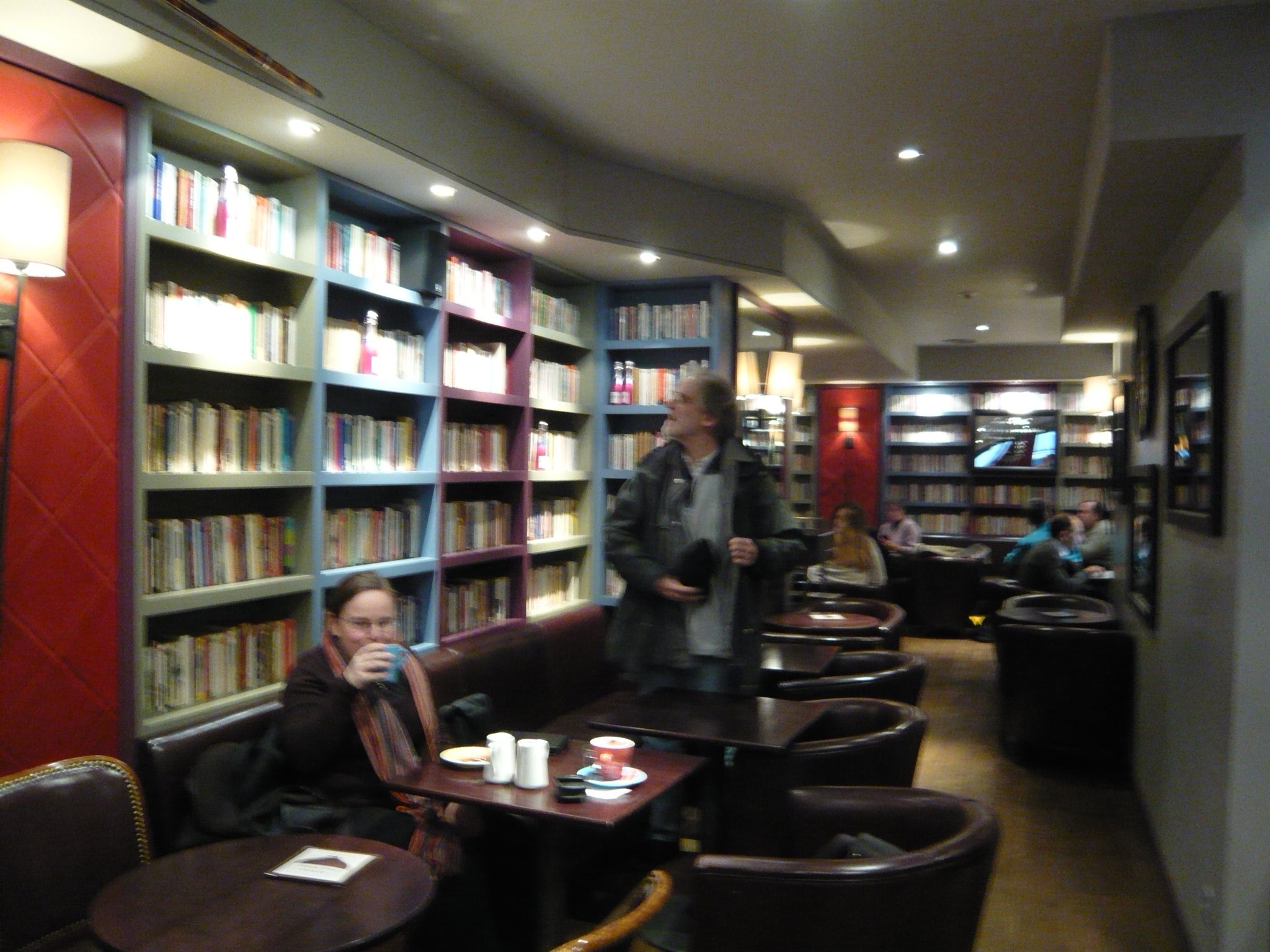 There you are : just to give you a sense of the place (the walls of this café are actually lined with paperbacks!); we didn't take any photographs of the different liquids that were consumed (we didn't want to make you people jealous --don't thank us, it's only natural) --and most of the people present you can see --except of course Polyglot who's behind the camera
