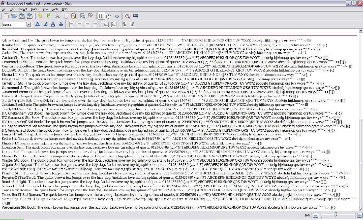 Attached is Take 2 of the embedded font test. More serif fonts included (39 now). Created in Word and Indesign CS4, fonts encrypted via Adobe encryption scheme. Reprocessed to add meta data in Calibre. If you see one you like, please go out an BUY IT. Don't Swipe It. Embedded fonts show up in ADE,Sony Desktop Reader, Sony Reader, Calibre. Embedded fonts do not show up in Firefox, Barnes & Noble Desktop. File would not open in Stanza PC, Opera. Anybody got something else to try it on? -bjc Last edited by brewt; 03-01-2010 at 09:24 PM. |