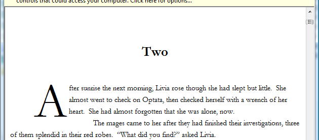 I have a word exported HTML file I can send you (It's a book a friend wrote), but html2lrf sticks the drop cap on a line by itself. I attached images to show what I meant. |