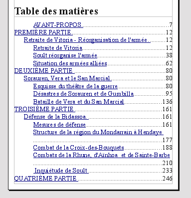 To make appear visually the structure, you also can use indents for TOCs. Ex: No indent for H1, 0,5cm for H2, 1cm for H3. (see image) On the other hand, OpenOffice provides you instantly with hypertext links for TOC entries and they are so handy with ebooks.. 2. The OpenOffice plugins for EPUB are not here yet. Escape is just another big piece of software, so I keep clear from it. Writer2epub is just starting. For the time being, I produce PDF for my screen size and ODT for the others. I feel no hurry because on my Sony at least, EPUB cannot yet use justified text. 3. What's the EPUB solution for 600 footnotes on a 800 pages book? (Not at all an extreme case, It happens so for many history books). With OpenOffice I could at least, before trying to hand over to calibre to format an epub, group all the footnotes at the end of the document. It's done instantly this way: (in French for me sorry) Menu: Outils/Notes de bas de page/Position.. select Fin de Document (and I also can modify instantly the numbering for all footnotes). This is not perfect for sure but it's a solution. How to avoid to scatter these many footnotes all along a book ? Last edited by roger64; 02-25-2010 at 12:20 AM. Reason: adding a TOC image |