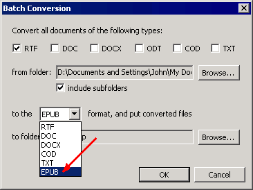 EPUB is not the only output format offered by this "batch conversion" command. It can convert RTF, DOC, DOCX, ODT, COD (the proprietary encrypted document format of Atlantis Word Processor), or TXT documents to the RTF, DOC, DOCX, COD, TXT, or EPUB format.