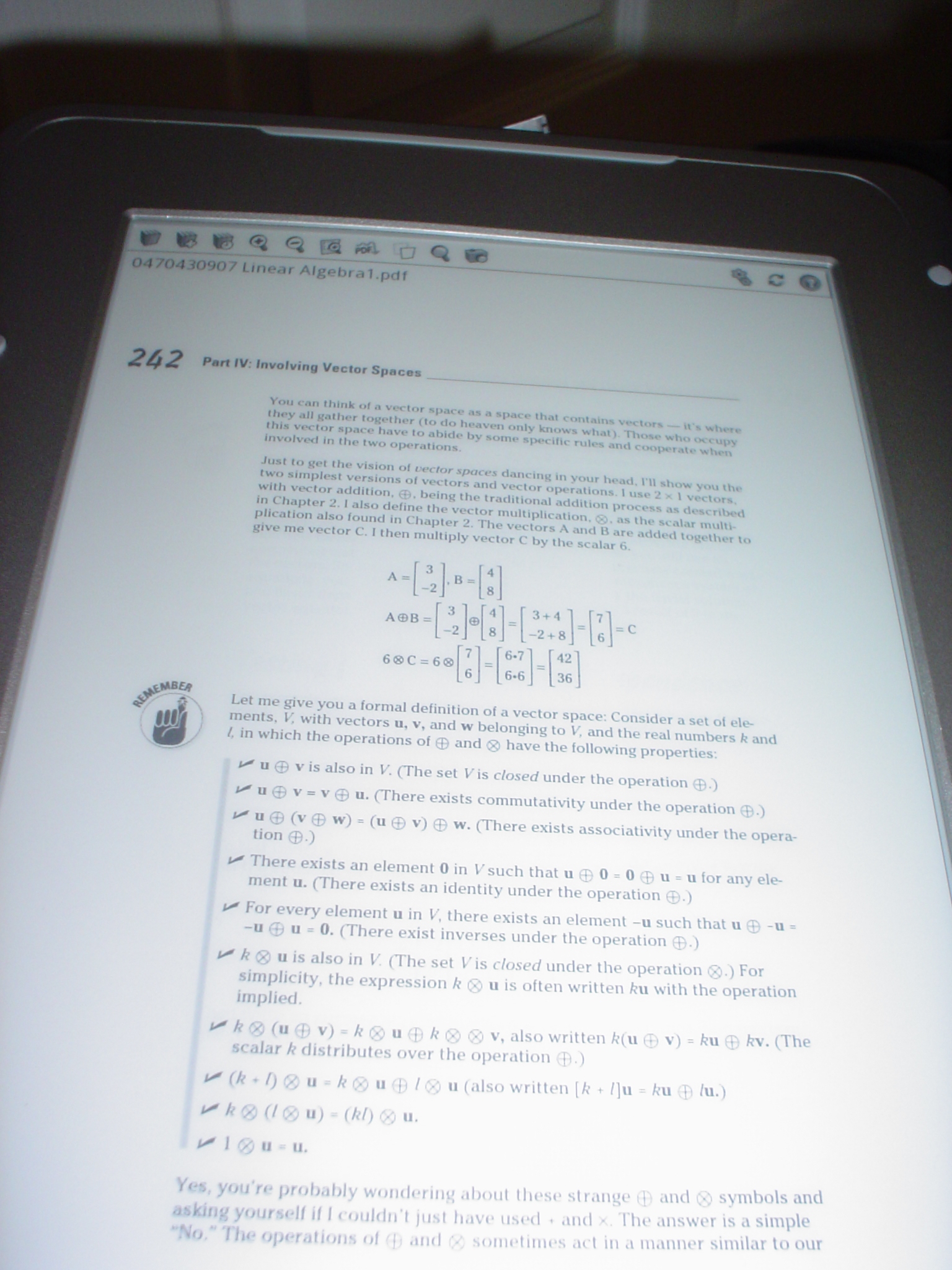 The more I use it, the more impressed I am. Excellent for a first generation release. Attached are some pictures of how the Edge has displayed some of my technical ebooks (PDFs). I am very satisfied so far. I will have more along with more pictures coming later with a better quality camera.