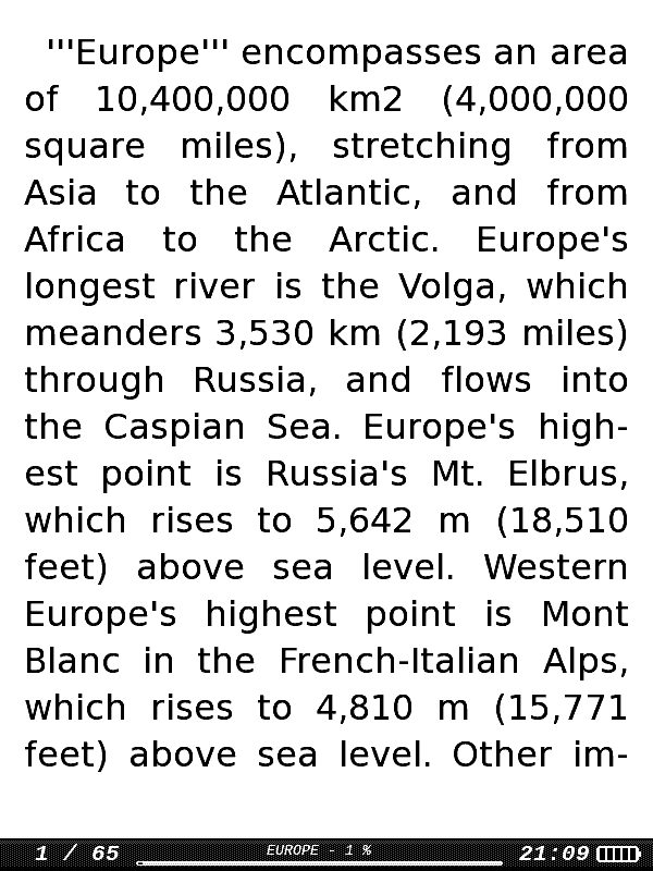 After spending the last days reading this forum I'm on the verge of buying a PB360. As I mainly want the PB360 for traveling I still want to know if somebody has been able to load a complete wikitravel and wikipedia set for offline use. For Wikitravel there is an offline version called OxygenGuide (http://code.google.com/p/oxygenguide/) I used in my Android device. OxygenGuide is a static HTML version of wikitravel without images. I think the PB360 has no HTML browser so even if I'm able to render the HTML pages, the hyperlinks will not work. Is this true? In this case I can always convert the HTML to .mobi. This is what the people do to have the guide on the Kindle (http://code.google.com/p/oxygenguide/wiki/Kindle). Does the PB360 open and render this file without problems? For Wikipedia is more difficult. I would like to have a complete offline English wikipedia on the PB360 but I think nobody has done it yet. - Does the hardware supports opening MASSIVE electronic books? The english wikipedia needs around 7GB so the epub will probably be too big. - I use AARD to read the offline wikipedia on my netbook. Is it a port of http://aarddict.org/ planned or possible? I hope you guys can help me with this issues! Best regards, David |