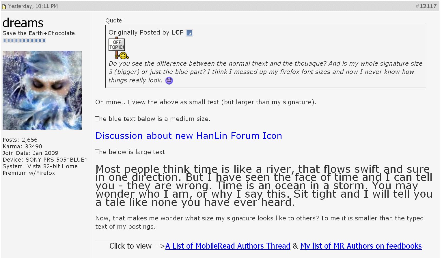 ![]() Wow, everyone's pic shows my text differently. On your pic, it shows my signature larger than the typed text. Very strange. Oh, well, I hope my signature size doesn't irritate a lot of people.
