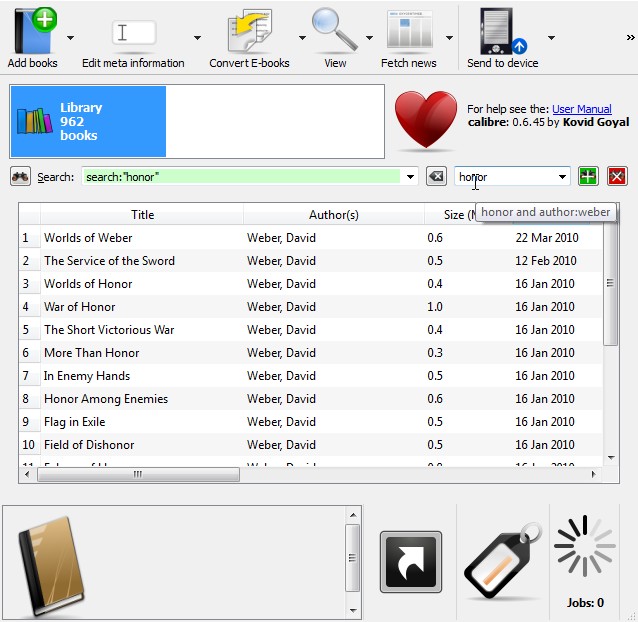 In an earlier thread, I heard that: 1. The name of the saved search should appear in the search box, not the value (the search itself). 2. There should be a way to select and create saved searches near the search box, without being required to open the tag browser. 3. Tooltips should be used to show the value of a saved search. 4. The tag browser should be used (as well) to select saved searches. The current (unreleased) implementation includes a try at items 1 - 3, along with a way to delete saved searches. The linked screen shots show what it looks like. I didn't embed the screen shots because doing so made the post almost impossible to read. 1. Just after calibre starts. This is what you see when the application starts. There is a new combo box and two new buttons on the right side of the search box. (attachment 1-after_opening.jpg) 2. After typing in a search. The search box contains the search (duh!). The saved search box is still empty. (attachment 2-After a search.jpg) 3. Named the search. I typed "honor" into the combo box and pressed the save button. Note that the text in the search box changed from the search itself to the name of the search. Note also the tooltip showing the search text. (attachment 3-Named a search.jpg) 4. Here is a shot with the combo box open, showing the available searches. There is no easy way (that I know of) for the tooltip to show each search. (attachment 4-Search selection open.jpg)5. I selected a different search (hammer). This screen looks much like 3. (attachment 5-A different search.jpg) Any suggestions? Be kind.