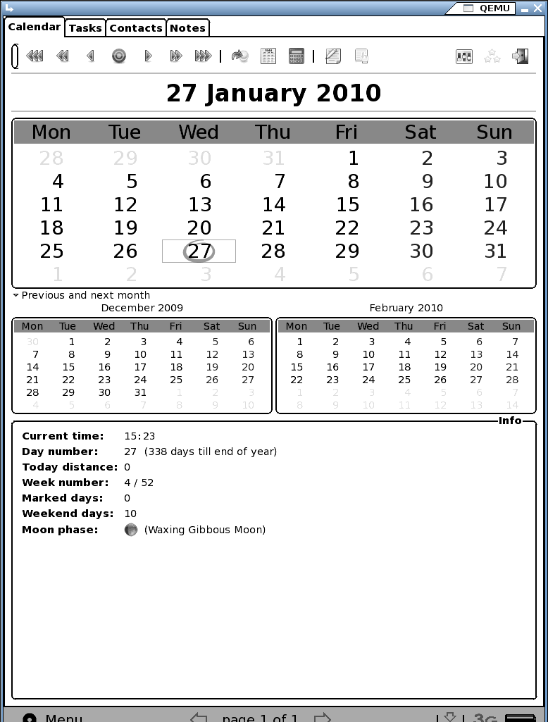 v4 - 2010/04/27 23:14 . needs libs from core _base package v1 v3 - 2010/04/17 00:03 . needs libs from core _base package v0: libical, libicalss, libicalvcal, libgtkspell . libgtkhtml is not included more, as DR base system includes it v2 - 2010/04/03 02:13 . updated to Osmo v0.2.10 . this new version requires libgtkhtml 2.x, compiled and included . fixed issues where keyboard remain visible after quit or at start . calendar: added a button to show popup menu (was mouse right-button) . calendar: click over date to select month . default font is smaller v1 - 2010/03/25 17:14 . based on Osmo v0.2.8 . configuration goes to /media/mmcblk0p1/Programs/_config/.osmo . added a quit button in the toolbar . compiled with ics support . in calendar summary, current time is only updated each minute, to avoid extra screen refresh and save battery . printing disabled v0 - 2010/03/24 . based on Osmo v0.2.8 . initial test release Last edited by Iņigo; 04-27-2010 at 08:23 PM. Reason: New release: v4 |