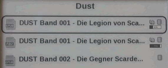 zZ sieht man, in der List, ob man ein Buch geöffnet hat oder nicht (anderes Icon). Schön wäre zB ein Progressbar darunter, wo man im Buch steht Ich hab's hier mal "reingemalt"... |