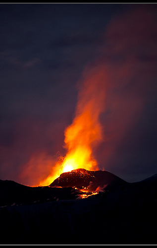 Eyjafjallajoekull there she blows, escapes from icy tomb, and climbs to heights above the gloom. to set the seeds for reddened skies; meandering loftly with streams of wind, to stir upon all that underlies its shadows. there she blows, ancient murmurs burst from molten womb to tarnish lives far beyond its icy tomb. tossed far above in heavens close to space, 'til distance, age and rain; brings it back to Mother Earth again. |