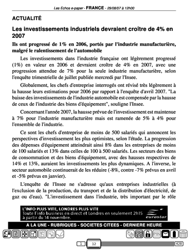 Aldus (a blog) also published a review and screenshots of Les Echos on the iLiad: http://aldus2006.typepad.fr/mon_webl...les-echos.html Snas: Qu'en est-il pour les gros sites spécialisés dans le livrel comme Mobileread et Feedbooks, comptez vous nous présenter aussi cette offre ? |