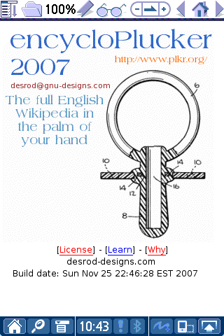 Soo... I decided to do it myself: Wikiquote in Plucker format Wikipedia in Plucker format (this one is HUGE) Wiktionary in Plucker format Below are some screenshots.. I'm working on cleaning it up quite a bit, and I might add some iSilo versions as well, but you get the idea. I have non-image and with-image versions, but with images its so prohibitively large to download, I'm going to be selling those on either CD/DVD or on SD cards directly. You saw it here first! <grin> |