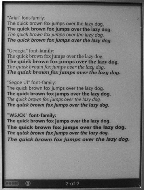 @font-face { font-family: "MSJim"; font-weight: normal; font-style: normal; src: url(res:///Data/fonts/georgia.ttf); } @font-face { font-family: "MSJim"; font-weight: bold; font-style: normal; src: url(res:///Data/fonts/georgiab.ttf); } @font-face { font-family: "MSJim"; font-weight: normal; font-style: italic; src: url(res:///Data/fonts/georgiai.ttf); } @font-face { font-family: "MSJim"; font-weight: bold; font-style: italic; src: url(res:///Data/fonts/georgiaz.ttf); } body { font-family: "MSJim", serif; } In this example, a statement like body { font-family: Georgia, serif; } located within an HTML document will cause the web browser to use the Georgia font to display the text. But the same statement in an ePub book would result in the Sony Reader being unable to interpret this statement and would instead display the ePub text in the Reader's default serif font. Why? Because the Sony Reader cannot interpret font names directly, fonts must be defined through @font-face statements. In this example, a statement like body { font-family: "MSJim, serif; } in an ePub book would tell the Sony Reader to use the MSJim font family. The Reader would then lookup the specifics on the MSJim font family, note that it uses the Georgia font, and thus display the text using the Georgia font. |