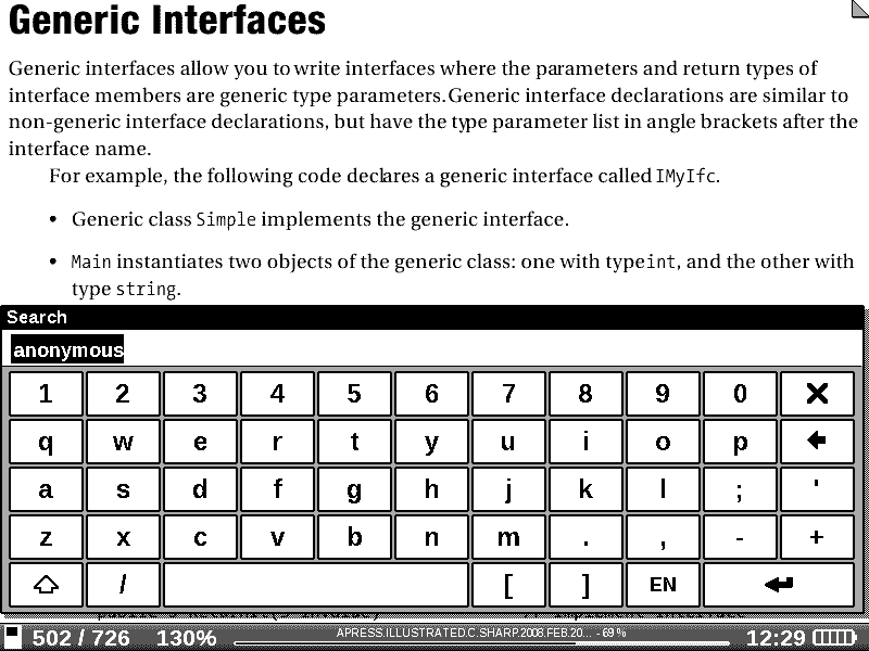 Two questions for you: (1) Can you use your PB 302 to view 1/3 to 1/2 a page at a time in landscape mode without using software to separate the document into smaller sized pages? This is not really important but I'm just sort of interested if you have a spare moment to answer. (2) How is keyword / string searching in the 302? How do you enter text to search, and can it search through groups of or all of your documents at once? (I am thinking that handwriting is useless, since I never write in my books anyway. I do like to write stuff down, but only on a blank sheet and I don't think the stylus input on any current ereader will be good enough to write down mathematical formulas, draw graphs and diagrams for cognitive aids, etc.) Last edited by exapted; 05-15-2010 at 02:40 AM. |