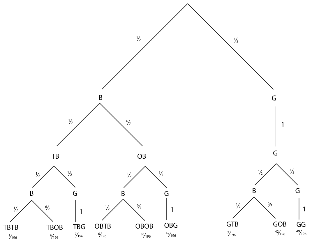 I like probability trees myself. In the attached chart, the first branch (top down) is the sex of the first child, the next is whether the child (if a boy) was born on a tuesday. The third branchings are for the sex of the second child, and the last for whether that child (of a boy) was born on a Tuesday. The probabilities across the bottom are the chance of getting to that outcome, normalised to fractions of 196 (= 2x7x2x7), and are obtained just by multiplying the probabilities of each branch that leads to that outcome. Now, we know that Dan has at least one boy, so we can ignore the GG outcome. And we also know that at least one of his children is a boy born on a Tuesday. So we can now ignore the outcomes that don't include a Boy born on a Tuesday - that's the OBOB, OBG and GOB outcomes. We're left with TBTB - 1/196 TBOB - 6/196 TBG - 7/196 OBTB - 6/196 GTB - 7/196 The total probability of getting one of these outcomes of 27/196. But in only TBTB, TBOB and OBTB do we have two boys - 13/196. So the probability of Dan having two boys, given that he has at least one boy and that Nick guessed a day correctly is 13 in 27. |