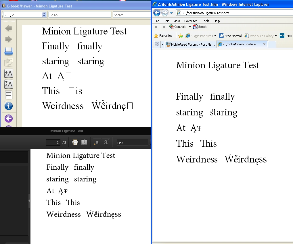 Attached is the pic, showing IE (which displays them correctly), Calibre and ADE.