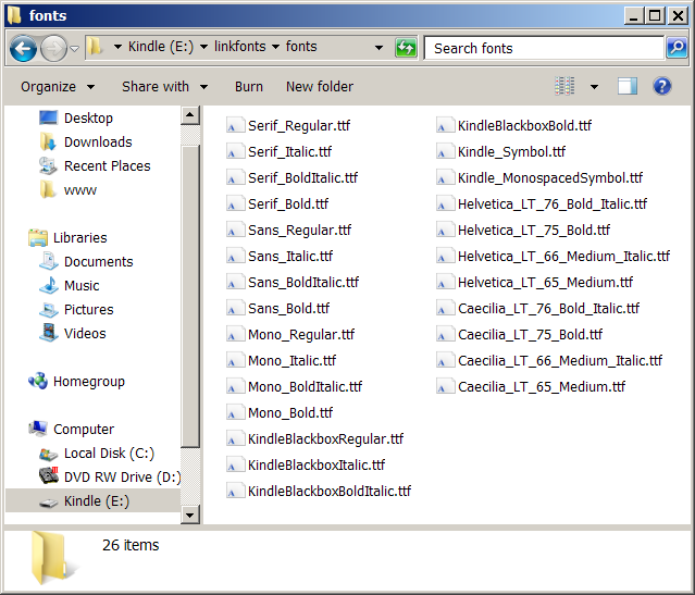 Here's my file list after copying the Helvetica2 fonts onto the Kindle, done on a Win7 machine, no hiding of extensions:
