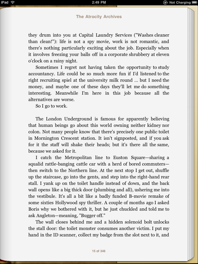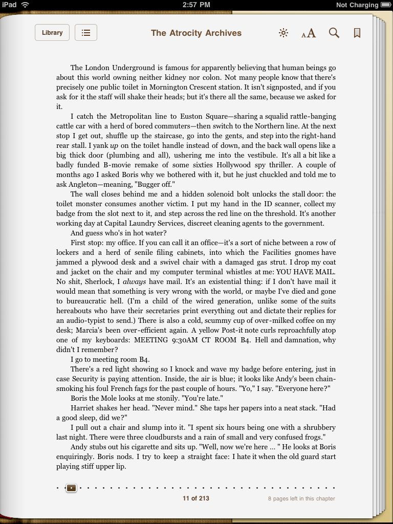 What's wrong with looking like eReader? Anyway, that's Stanza using Helvetica because I personally find a sans serif font easier for reading at smaller font sizes than a serif font (the serifs get in the way and make things more jumbled). Helvetica works for me. Unfortunately iBooks only exposes Verdana, which does not. I've also intentionally enabled both paragraph indent and paragraph spacing because I like having both. Yes, I realize you're only "supposed" to do one or the other, but if I want both why not let me have both? If my font, margin, indentation, and spacing choices are "ugly" to you, you're completely welcome to change those values in Stanza