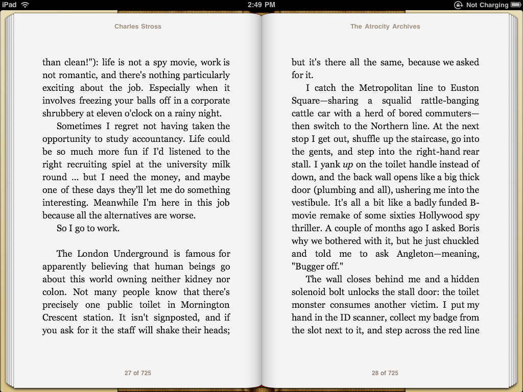 But, I also realize that Stanza is a mature product. Been around for years and all they had to do was port it to the iPad. iBooks is a brand new product, and I hope over time will develop into a top notch reader, with lots of options.... Even something as simple as adding the Sepia option is a step in the right direction. Perhaps in the next release they will have a slider for the margins as well. And at some point it would be nice to have the option to get rid of the whole imitation paper book look. While it's impressive to show someone, for folks like me that have been reading ebooks for 10 years it's really pointless.