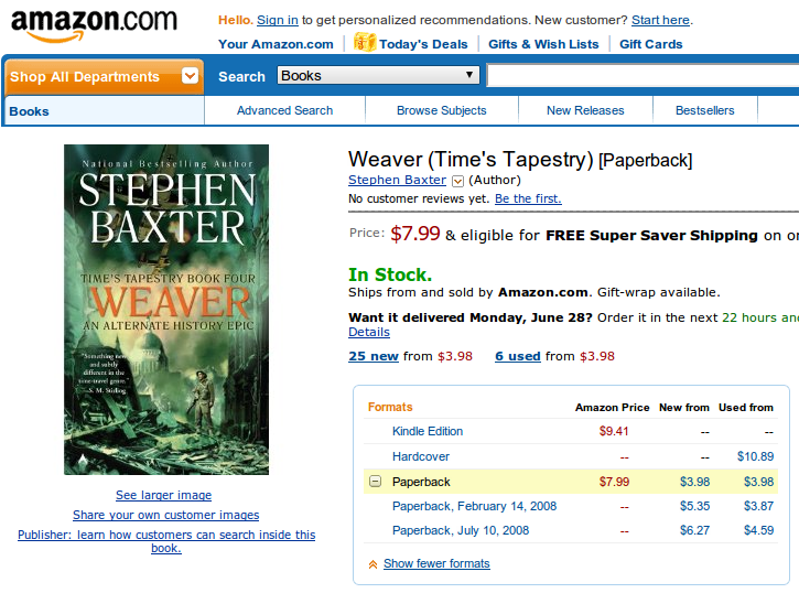 ![]() When I see eBooks cheaper then (1-1/5)x"Price of the paper book" (that is, less then 80%), I will believe the old argument that Amazon is pushing the prices low in order to sell Kindle devices. But with all the other cheap ereaders now available, that hypothesis (about the razor and blades business model with Kindle) cannot be upgraded to a theory. I am more inclined to believe that the publishers do not want the ebook business to succeed, at least not yet. |