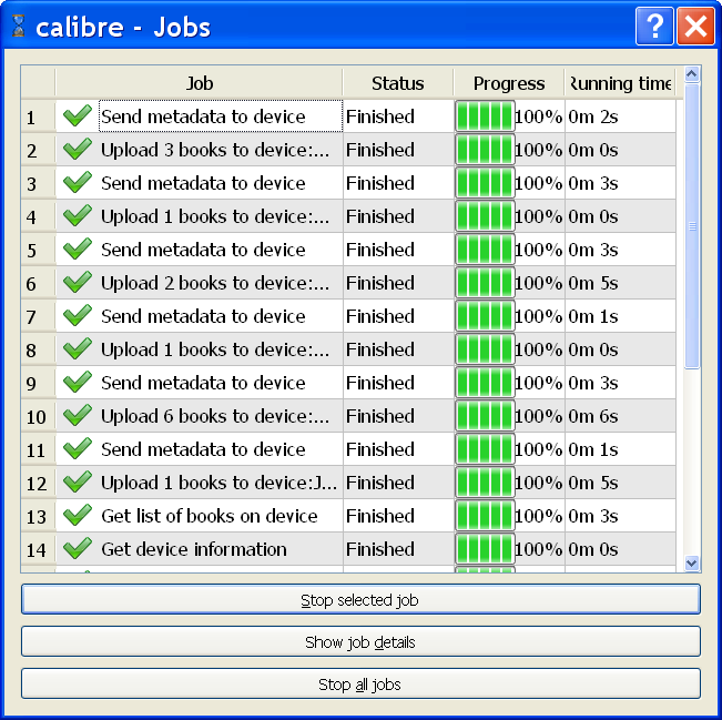 Could you at least consider having the metadata update once at the end of all jobs run? It won't allow me to stop any of these "extra" jobs - so I can't even stop it. NOTE: Windows XP, calibre 0.7.4 Last edited by FizzyWater; 06-28-2010 at 03:52 AM. Reason: forgot to include the OS and version |