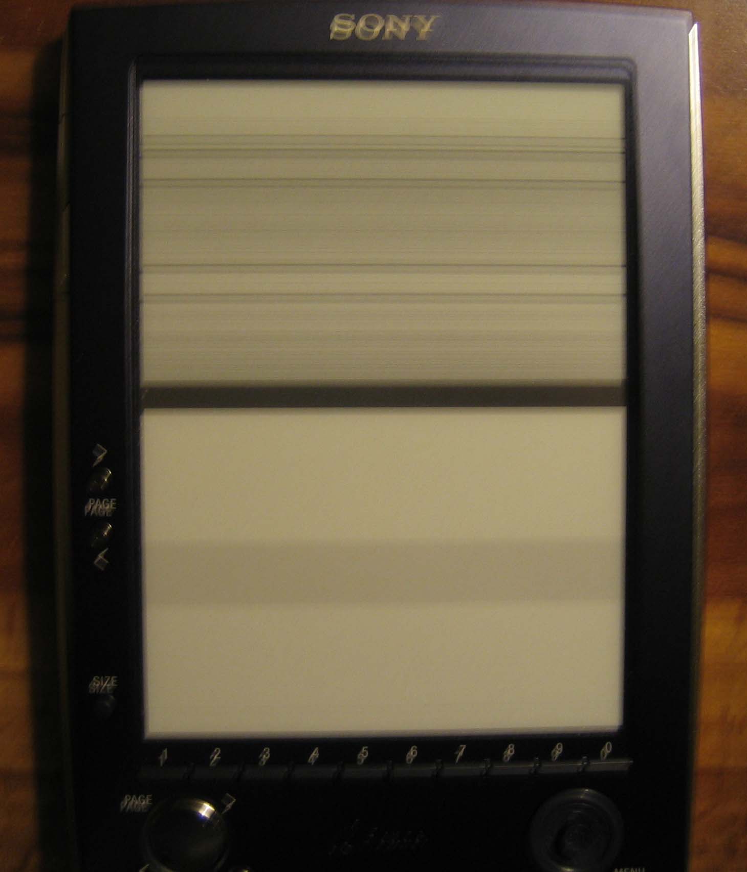 The next day, I proceeded to charge the reader through USB while I worked on my computer. Towards the end of the day, I disconnected the reader and turned it on. I was surprised to see that the lower half of the screen was still dead. I jumped onto mobileread at this point and followed the instructions for both hard and soft resets. None of these helped. I fussed around with the reader for a few more hours turning it on and off, running off AC, doing more resets, checking the memory through CONNECT, etc.. While I was doing this, I noticed the screen was getting worse. It went from half screen to corruption on the remaining half to a total blank screen minus a few ghosting artifacts. Currently, I can no longer get it to display any kind of text. It just shows lines. I know some of you have had similar problems. Can anyone shed light on what went wrong? I don't recall applying pressure to the screen. It's been more or less sitting on my desk or on the back seat of my car. I plan on claiming warranty since I've had it for less than 90 days. Sony would fix a problem like this, wouldn't they? |