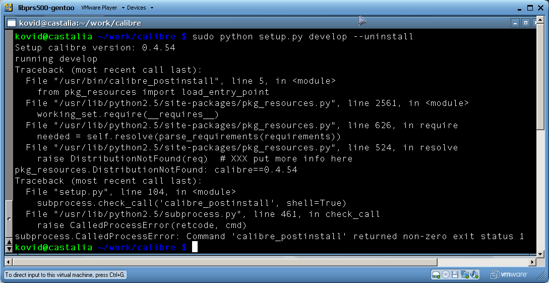 Once you have your vm session running with a valid network connection (see above), the following commands worked for me: 1 - rm -Rf calibre 2 - bzr branch http://bzr.kovidgoyal.net/code/calibre/trunk calibre 3 - sudo emerge sync 4 - sudo emerge dev-python/lxml dev-python/PyQt dev-python/beautifulsoup PyQT is taking a loooong time to emerge so I'll post back if I can now build after these finish Cheers, Crazy Last edited by RoninTech; 11-01-2008 at 06:38 PM. |