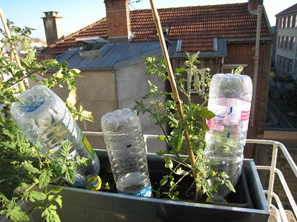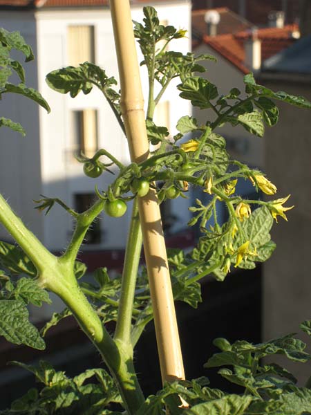 I am deliriously happy! I just came back from a three-day week-end with my parents, and I was half expecting a window-sill disaster. I very hastily set up an irrigation system before I left on Friday morning, and apparently it worked. Not only are my plants healthy, but the rocket has grown like crazy, and there are now tiny little tomatoes