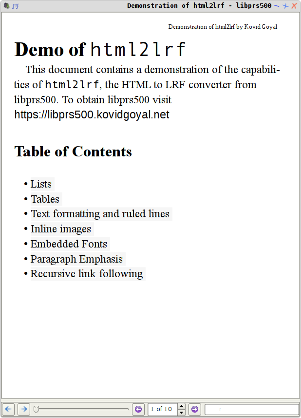 lrfviewer mybook.lrf It doesn't support the DrawChar tag as yet (Used to make drop-caps) and the search functionality is not implemented. |