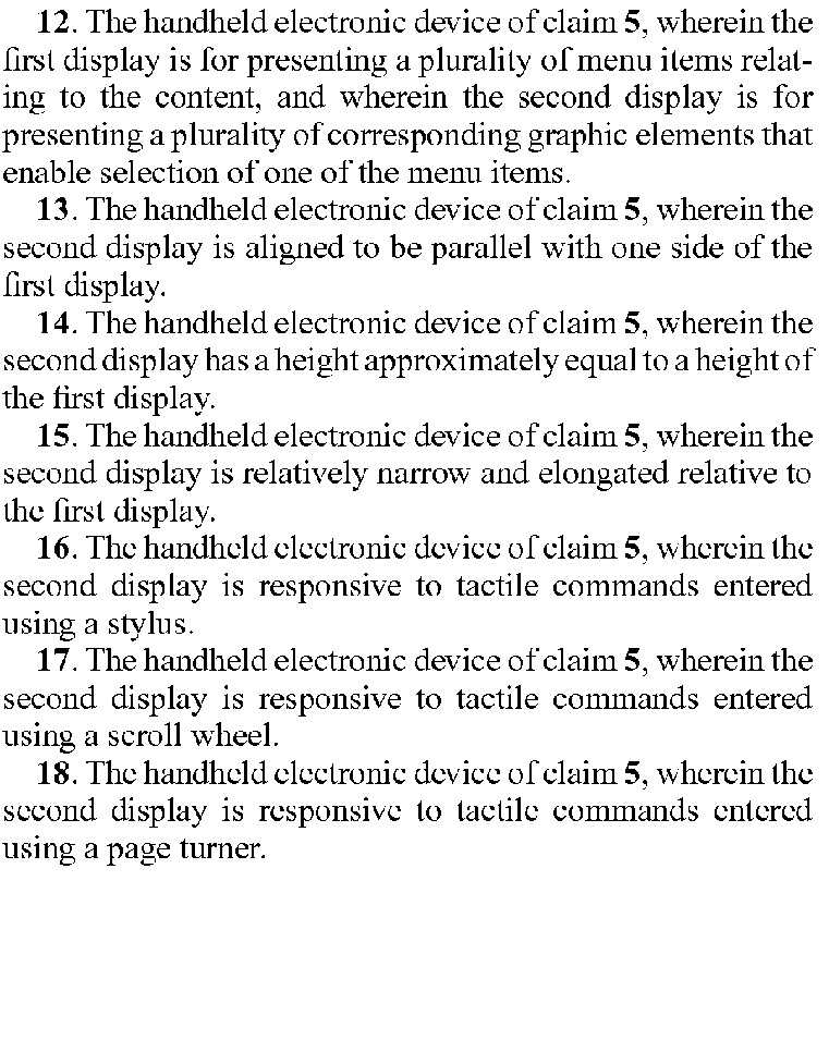 I could'a sworn I did an earlier post on this, but.... The patent is far more specific than the article implies. In fact, it's pretty much a patent on the Kindle 1 and that's about it. The article only quotes the summary; it's followed up by numerous illustrations of the Kindle 1, and pages of specific details. The patent specifically cites a "vertical" secondary screen that is parallel to the main display and uses a cursor, an asymmetrical design, etc etc. No one is likely to get sued over this patent. The US patent system may not be perfect, but this is not an example the problems of that system. If anything, it's an indication of sloppy blogging that is more interested in pageviews than in accuracy. |