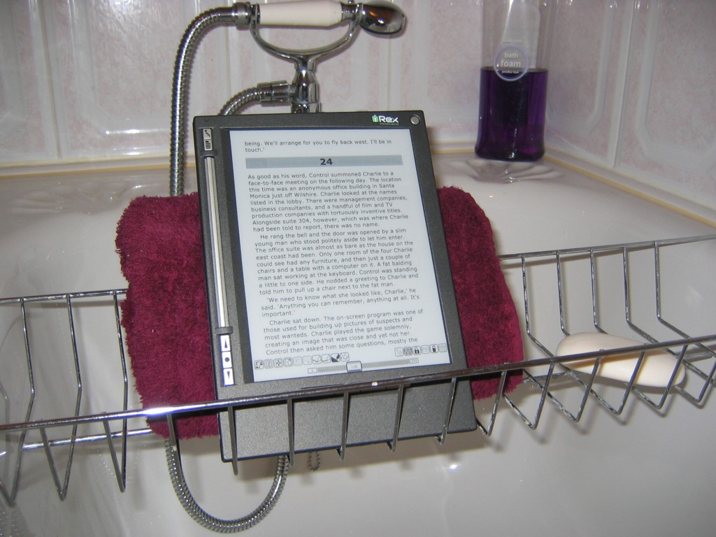 For years I read my Rocketbook in the tub, and now I'm using the Reader; the trick is - just don't drop it! Have a towel by the tub to dry your hands with before you pick it up, and you should be fine. I've never dropped a paper book in the tub, and the same goes for the e-book readers... I say just go for it, be reasonably careful, and you shouldn't have a problem. (though that tub rack is a pretty cool idea!) |