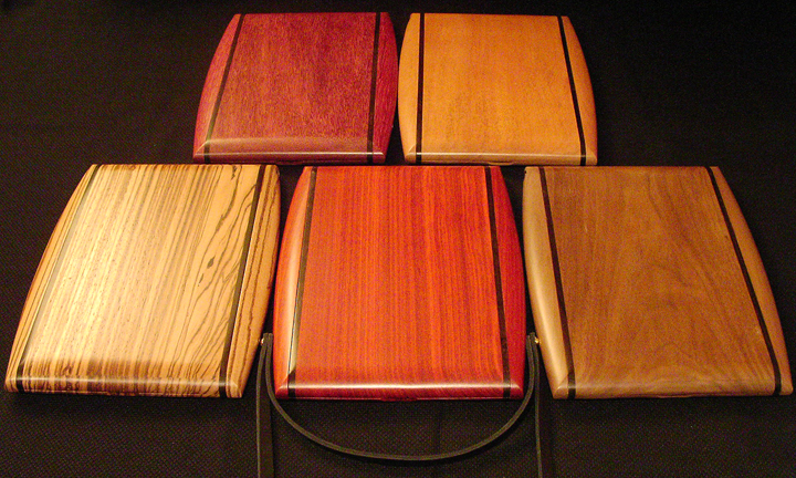 Here is a picture showing some new colors. These are the natural colors of the woods I feature. I hate stains, they don't repair well, which defeats durability. All of them feature Blackwood or Granadillo as the accent strip and the track lights. In order at the top left is Mexican purpleheart (Peltogyne spp.) Top right is African Mahogany (Khaya Ivorensis) Lower left is the Zebrano you've already seen. Lower center is Satinee or Bloodwood (Brosimum Paraence) And lower right American Walnut (Juglans Nigra) I have made some changes to the battery compartment. It now comes out by inserting both your indexes on top where the safe switch is and pulling towards you. The little battery box is fitted with springed berrings at each end that serve also as the contacts. When it's out, on it's right side you remove the two tiny screws (with a #0 flat screwdriver)of the copper top to have access to three AAA batteries. Of course and of preference, you can use rechargeables. I felt that the box being wood it needed an organic touch, so I have upgraded the strap to two leather beauties. A short one that can serve as a handle and the other one as a shoulder tote. Both of them can easily be removed by loosening two polished brass screws. To me the best improvement is the fact that the reader is better maintained in place by powerful 3/8"rare earth magnets. I've placed two pair in relation to the position you choose to put the Reader in. And I've groved holes for the reader's little feet at the right places. One of the pictures shows you the box opened on it's back lighted only on it's own power. I got to tell you it's a great reading experience…In that configuration you can, with the longer strap around your neck, read standing up with the box partly resting on your lower chest. It won't stay by itself but it will take most of the weight off your hands. And of course as in the picture. You can read flat on your back without holding the reader, but you can't go far past 90 degrees cause it'll start to tilt towards you. In this position there is absolutely no glare from the LEDs. The problem with the backthreading of the tension in the hinge screws has been easily fixed. The longer(for more friction) insert nut was epoxied in place and the polished brass screws have been 'loctited' with a medium strength compound. No trouble up to date. The new size is : 7.5" wide by 9.75" long by.875" thick and weigh is 22 to 32 oz.(depending on type of wood) with included AAA alcaline batteries and straps. |