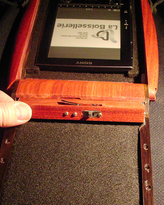 By now many of you have noticed yvanleterrible’s new Avatar, and may be interested in knowing a bit more about it.Back around the end of October, Yvan asked me if I’d be willing to review a box if he went ahead and built one. I said I’d be willing if he wanted to do so. On Monday, December 4th the prototype arrived. Before I go too far, I need to point out clearly that this is a prototype, and has a (surprisingly) few prototype-related issues. These are primarily a result of the fact that it was built entirely from measurements that were transmitted over e-mail. Yvan, being in Canada, has not yet seen a Reader for himself (since Sony, in its wisdom, has not yet launched the Reader there -- something that we all hope will change shortly). It’s really tough to build something to fit an object that you’ve never seen for yourself, so please keep that in mind as you read. Also, since I’m the one who took the measurements for him, I claim the lion’s share of responsibility for any faults that came from them. I’m also fully confident that Yvan will be able to fully resolve those faults in future builds (we’re working to fine tune the measurements) -- that's part of what prototypes are for, after all. ![]() Also Yvan specifically requested that I make it clear that this is very much a luxury item. It’s pretty pricey at $384 ($310 without lighting), but it’s also extremely nice. Okay, on to the box itself. My only coherent thought for the first five minutes or so after opening the packaging was a constant refrain of “It’s be-yu-tee-ful!” The box is a gorgeous piece of work, made of Zebrano wood with Blackwood accents its appearance is quite striking (see attached pictures, please). The finish on the box is a nice lacquer, and the form of it is very pleasant to look at and to hold, with flowing rounded corners and edges that are a joy to the touch. The overall construction is very tight, and the joining work is excellent. I’m not a professional woodworker, but my father was in a former life, and I watched him enough growing up to know good work when I see it, and this is very good work, indeed. The lid’s pin and socket latch closes with a satisfying, muted click, which reassures that it will stay that way. The lining of the prototype is black felt (there’s been some discussion of adding strategically placed neoprene in the future). Running along each of the left and right edges of the lid are two LED “track lights” (ten LEDs in all, five on either edge) which do a marvelous job of lighting the screen with minimal glare -- the trick is to get the lid’s angle to the rest of the box just right (it’s a bit off in the attached pictures). The lighting is controlled by a sliding switch as well as a switch that turns the lights off automatically when the lid is closed, which reduces drain on the batteries -- just get the lid closed before dozing off completely. The lights are powered by AAA batteries, so they should last a good while on a set, and I’ve noticed no dimming in a week of use. The batteries are behind a screw-down cover in the prototype, but Yvan has plans to change that to something easier to deal with in future boxes.The felt on the inside of the lid is a nice double-thick piece that adds an extra layer of protection for the screen. The Reader sits in the base of the box between two contoured “stabilizers” which keep it from moving around in the box. This is the first prototype issue that I’d like to comment on, and it’s a result of the difficulty of getting accurate measurements from Houston to Montreal. The stabilizers allow about 1/16th of an inch too much play side to side and top to bottom, they also could be a bit taller relative to the Reader’s thickness. Yvan is looking into lining them with neoprene to provide more ‘grab’ on the Reader itself, and as I said, we’re working on getting better measurements. As it is, I’ve found a bit of sticky-backed Velcro grabs the felt nicely to hold the Reader firmly in place. That really is the only fit drawback I’ve seen with the box, given more accurate measurements, I’m quite confident it will be entirely resolved. The box also includes connection points for a shoulder/neck strap. The ones you see in the pictures are not the ones that Yvan intends to use long-term, but they were available when he needed them on short notice, so take that into account. I’ve been using the box for about a week now, so I think I’ve got a reasonably good feel for it. Far and away the most useful aspect of the box is the lighting. I found that if I put the Reader “upside-down” in the box (with the base of the Reader toward the hinges) then the lid makes an excellent reading stand for lying in bed. The lights illuminate the screen fully, and, as I mentioned, with very little glare (right at the edges of the corners). When I get ready to doze off, I just close the lid, the lights turn off automatically, and I let the Reader turn itself off on its own schedule (an hour). I can set the box aside without needing to worry about anything else. Including missing the night table, which brings me to the next best thing about the box, it’s very good protection for the Reader. When closed, the Reader is surrounded on all sides by nice, sturdy wood. No need to worry about the screen, or drops from reasonable heights. Of course such drops may do undesirable things to the wood, but the Reader ought to be fine. Note that I did not go tossing it about to test this. ![]() I also found the box to be nice for reading in a seated position where I can rest it on a desk/table top, or in my lap. The extra width that the box adds around the edges of the Reader actually makes the page buttons (all 3 of them) much more comfortable for me to reach. Results on this point will naturally vary with hand size. On the down-side, the box is fairly heavy, which makes reading with it unsupported (standing or walking, for example