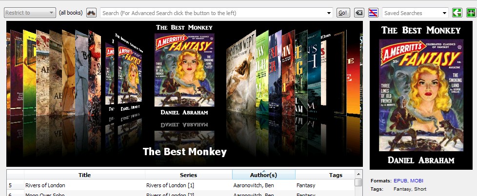 So what I do is use a black background, which gives a nice effect on the cover browser. I don't mind the background being black on the book details panel. In answer to your question on short stories, what I do is have a bunch of images which represent different genres, and have those embedded in the cover. So there is not a "short story" image as such, just a genre one. The reality has been for the books I have that in 99% of cases if it isn't a short story then there is an official cover for the book. In terms of the choice of images, what I did was usually find some classic old magazine covers from google images, where the name of the magazine reflects the genre. |