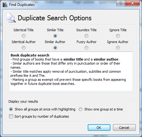 Another option I am considering on this dialog is to remove the "Title match:" and "Author match:" labels on the left, as per the second screenshot. Any preferences? The text changes based on your selection obviously. If you choose Ignore Title and Ignore Author then the text tells you that it is an ISBN search. And just for drMerry there is a checkbox for sorting... I've resolved the partitioning algorithm issues btw. Went back to basics and wrote the "kiwidude" version, undoubtedly not as pretty but it works pretty darn quick, sub-second searches of large libraries again regardless of the number of duplicates. |