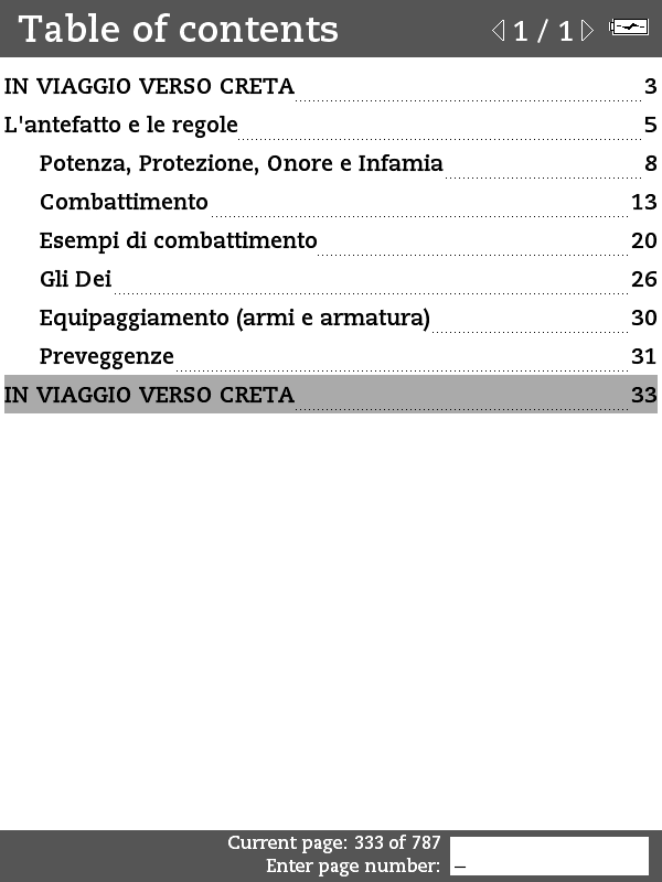 I have CoolReader 3.0.56-17 from Apr 15 2012. Here are two screenshots, one with TOC and one without TOC. With TOC, if I tap on a chapter, I get a number displayed in the box down in the page (the number changes if I tap on different part of the screen). Without TOC I get the same behaviour but I can't see (obviously) chapters... |