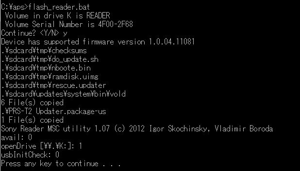 Last week I bought new device in Belgium. Firmware version is 1.0.04.11081. When I am trying to run jailbreak I can see the following messages on a screen: C:\Reader\rupor-jailbreak>flash_reader.bat Volume in drive D has no label. Volume Serial Number is 420A-13E9 Continue? <Y/N> Y .\OS Firmware\files\new.mmcblk2p2.img .\OS Firmware\files\new.mmcblk2p2.md5 .\OS Firmware\files\update.img .\OS Firmware\files\update.img.sig2 4 File(s) copied Sony Reader MSC utility 1.07 (c) 2012 Igor Skochinsky, Vladimir Boroda avail: 1 openDrive [\\.\D:]: 1 usbInitCheck: 0 Press any key to continue . . . After reboot device doesn't show update screen and just starting. I am using 32 Gb SD card. Could it be a problem? |