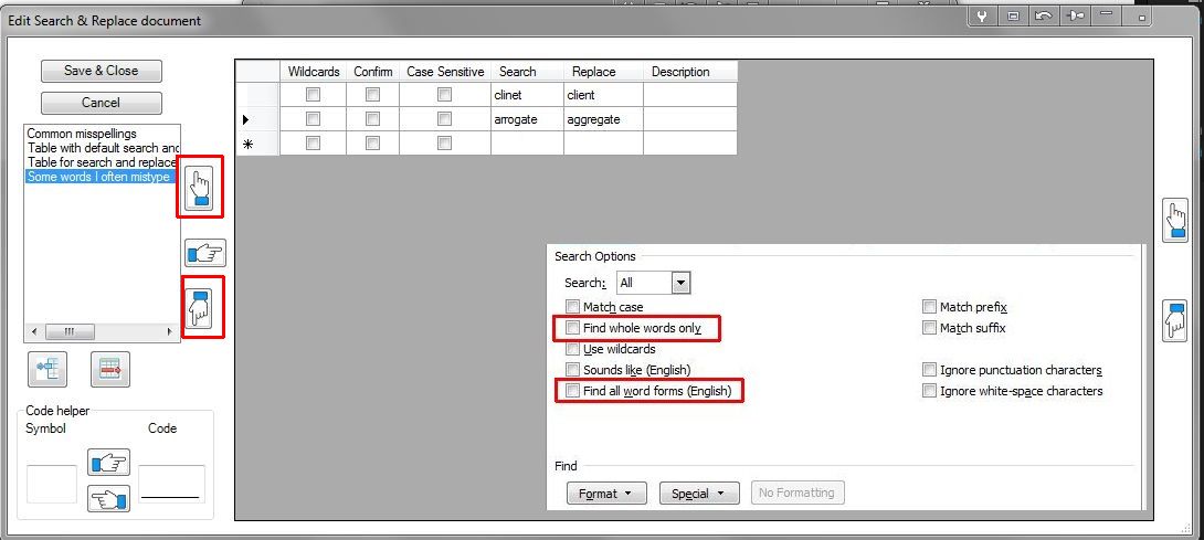 whole words only - Say I want to replace leaned with leant, but I wouldn't want cleaned to be changed to cleant. So in vanilla Word S&R I would check whole words only. My experience is that using a leading or trailing space wont work because of adjacent quotes and punctuation. find all word forms - I would use this if I wanted to do replaces such as realise with realize, it will pick up words like realisation, realised etc. I import quite a lot of documents where both the US & UK spelling variants are contained within the same document The Word dictionary I use allows both variants. I could use a Word Exclusion dictionary to disallow realise and all forms thereof, but... sometimes for political reasons I prefer to have the UK spelling variant. These mixed spelling documents are most often found in translations of public domain documents emanating from Continental Europe. I think I already said I'm a bit OCD on matters of consistency. Quote: