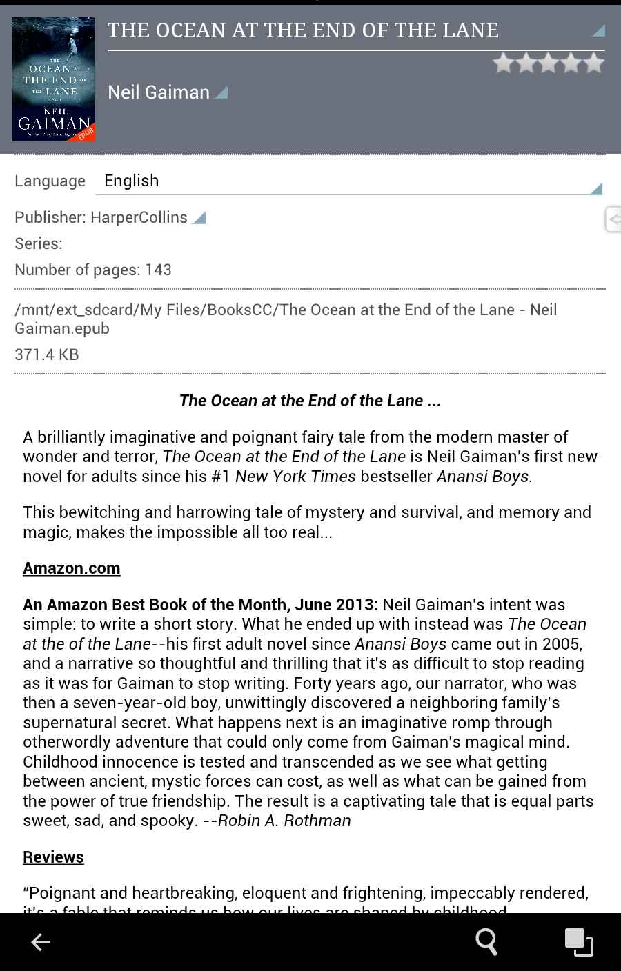 No, I never use Calibre's "jacket" feature. I am talking about Mantano's book details page, which is equivalent to CC's book details page. I have attached a screenshot from Mantano to show what I am talking about. The information shown on this page is not inside the book that can be read in the "reader" portion of Mantano. It's only in the OPF file. It shows bold, italics and centering. So I was just wondering if perhaps Mantano was reading the OPF file to get its information, whereas CC gets the information from Calibre's database/content server? From a different source? --Pat | |