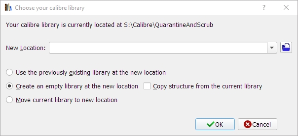 There is only one way to create an empty Calibre library: through the standard Calibre menu icon. Your new Pristine Library should not be a Q&S library. It should be 100% standard Calibre. See the attached image.