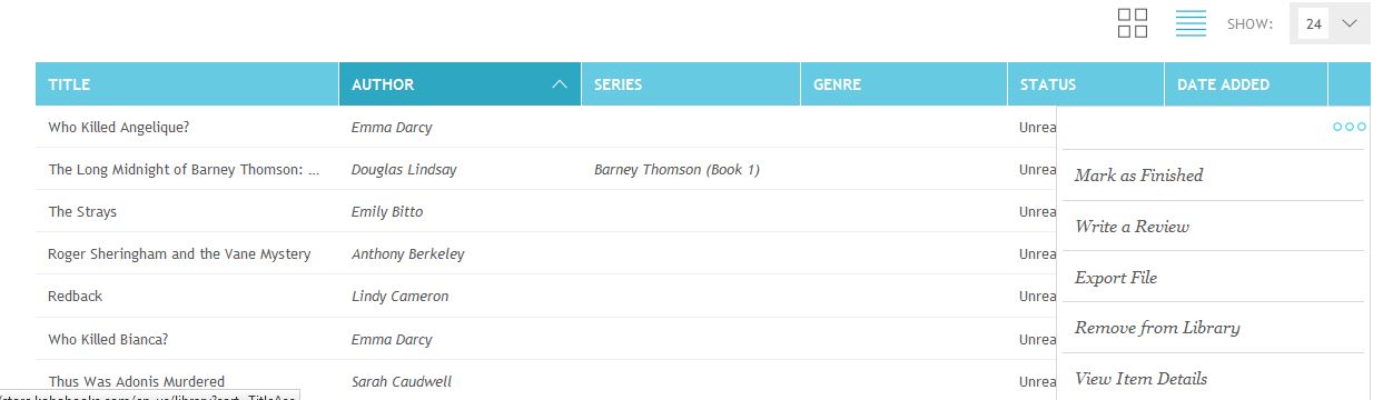 Would love the ability to change status in bulk. Right now there's a button at the top which allows me to see "finished" books only. But they're 18 random books from ages ago which I've probably never even downloaded to my Kobo. (Same for many of the "0% read" that were showing in the status column before it was hidden.)